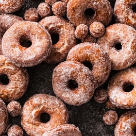 Return oil to 350 degrees and, using spider skimmer or slotted spoon, carefully add doughnut holes to hot oil. Cook, stirring often, until deep golden brown, about 2 minutes. Transfer to paper towel–lined side of wire rack. Lightly toss doughnuts and doughnut holes in coating and transfer to unlined side of wire rack. Serve.