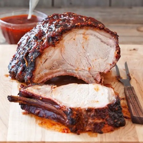 Remove pan from grill, tent roast loosely with foil, and let pork rest in sauce for 30 minutes. Transfer pork to carving board and pour sauce into serving vessel, skimming off fat as necessary. (You should have about 2 cups sauce.) Carve pork in between ribs into thick chops. Serve, passing sauce at table.