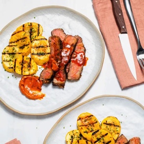 Grill squash until lightly charred and tender, about 3 minutes per side. Return squash to bowl. Add 1 tablespoon butter mixture and remaining 1 teaspoon lemon juice and toss to combine. Slice steaks and serve with squash, sprinkling squash with remaining 1 tablespoon chives and passing remaining butter mixture separately.