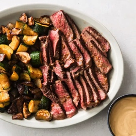Transfer vegetables to serving platter. Slice steaks ¼ inch thick and transfer to platter with vegetables. Drizzle steaks with remaining soy-garlic butter. Serve.